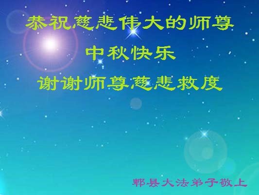 在中秋佳节之际,我们全体大法弟子跪拜师尊:恭祝师尊中秋节快乐!弟子们一定会做好三件事,谨遵师命,抢人、救人,多救人,完成我们的史前大愿,圆满随师还。