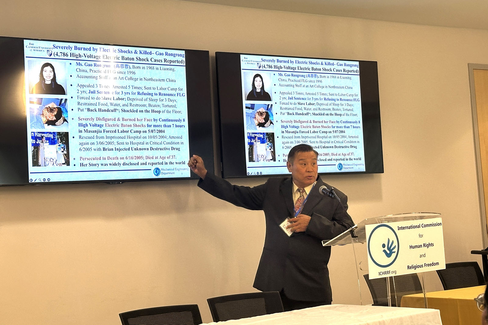 【明慧网二零二五年十月十二日】(明慧记者李静菲美国弗吉尼亚州报道)二零二五年十月十日和十一日,国际人权与宗教自由委员会在美国弗吉尼亚州洛顿(Lorton, VA)举办了为期两天的年会,专家们探讨了当前全球女性遭受的暴行。人权中心研究员、美国天主教大学工程学荣誉退休教授聂森博士在会上讲述了在中国持续发生的中共对法轮功女学员的迫害