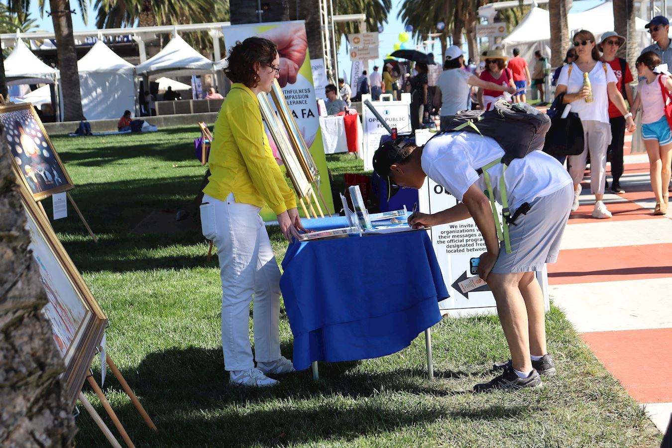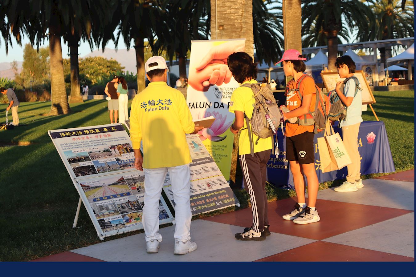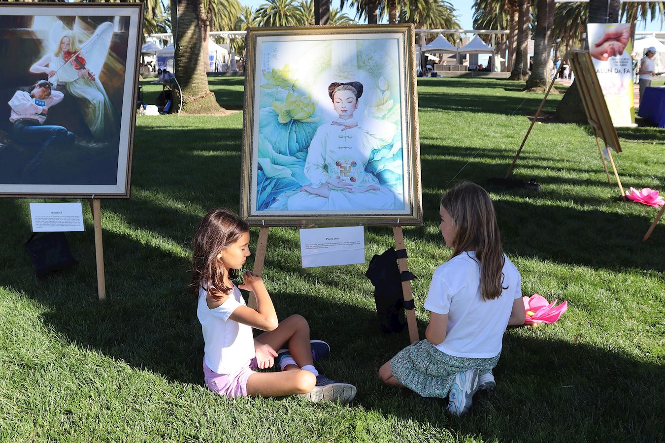 草坪上展示着“真善忍美展”的画作,有人驻足观看,有的人会停下来询问。两位妇女询问时,随行的女孩们去看画展,然后学着画中人物打坐的姿势坐下;有小学员过去教动作,她们离开时开心地拿着小莲花礼物。