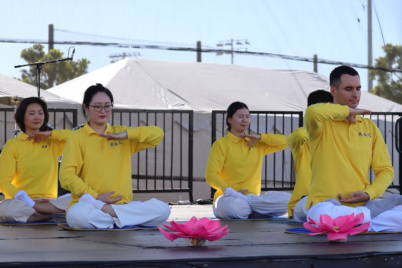 法轮功学员在舞台上向居民介绍功法,和修炼后的身心改善的美好经历。舒缓平和的音乐给喧闹的环境带来一片祥和。