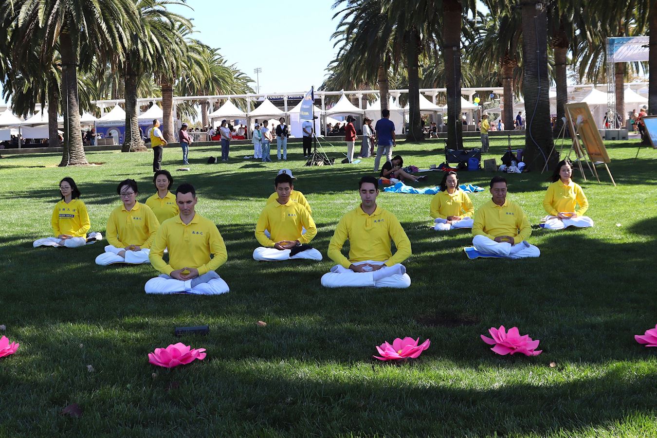 不仅在舞台上,在大公园主停车场对面的草坪以及公园入口附近,从上午到下午,不断地有法轮大法的学员前来向人们展示五套功法。