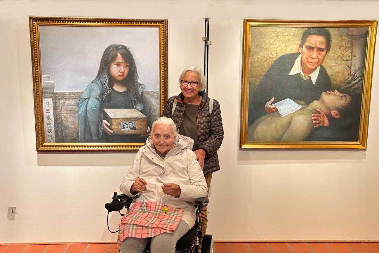 多名当地中学生组团参观后,在作品前合影留念。一位女士陪同轮椅上的年长者观展,耐心地为她朗读每幅作品的说明,两人神情专注。她在留言簿写下:“极其感人、震撼的艺术作品,会在心中久久回荡。”