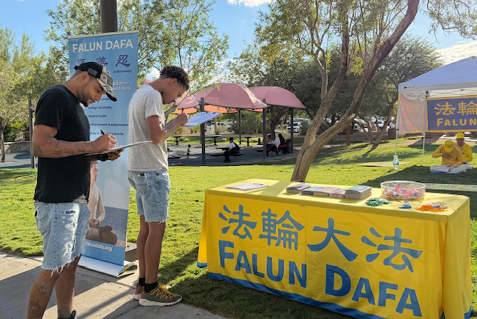 两人与学员交谈,明白法轮功真相后在支持《法轮功保护法案》征签表上签名,并询问学员:“我们可以试一试和你们一起炼功吗?”两人兴奋的加入到队伍中跟着学炼法轮功第三套功法。学员向他们解释了动作要领,他们面带微笑,学的有模有样。艾萨克说:“炼完功感觉很有精神,很轻松。”两人愉快的和小学员聊了一阵。