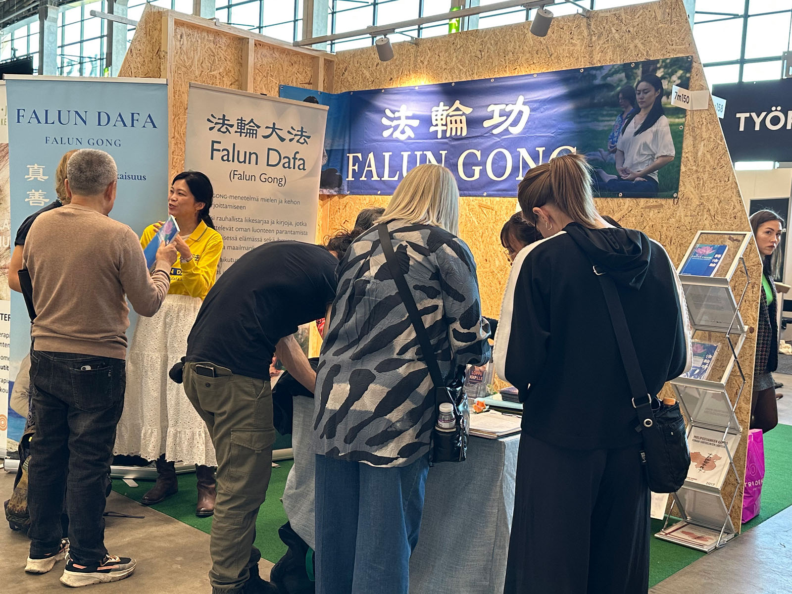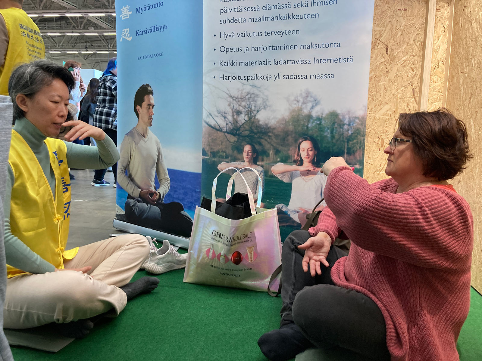 芬兰人雅科(Jaakko)来到法轮大法的展位前。他说自己是个非常敏感的人,能够很强烈感受到周围环境的能量。他表示,法轮大法的“真、善、忍”三大原则非常珍贵,功法听起来很好,于是当场学习。一个小时炼功后,他惊喜地说,身体感觉非常舒服。尽管他从未打坐过,却第一次就能静坐半小时。