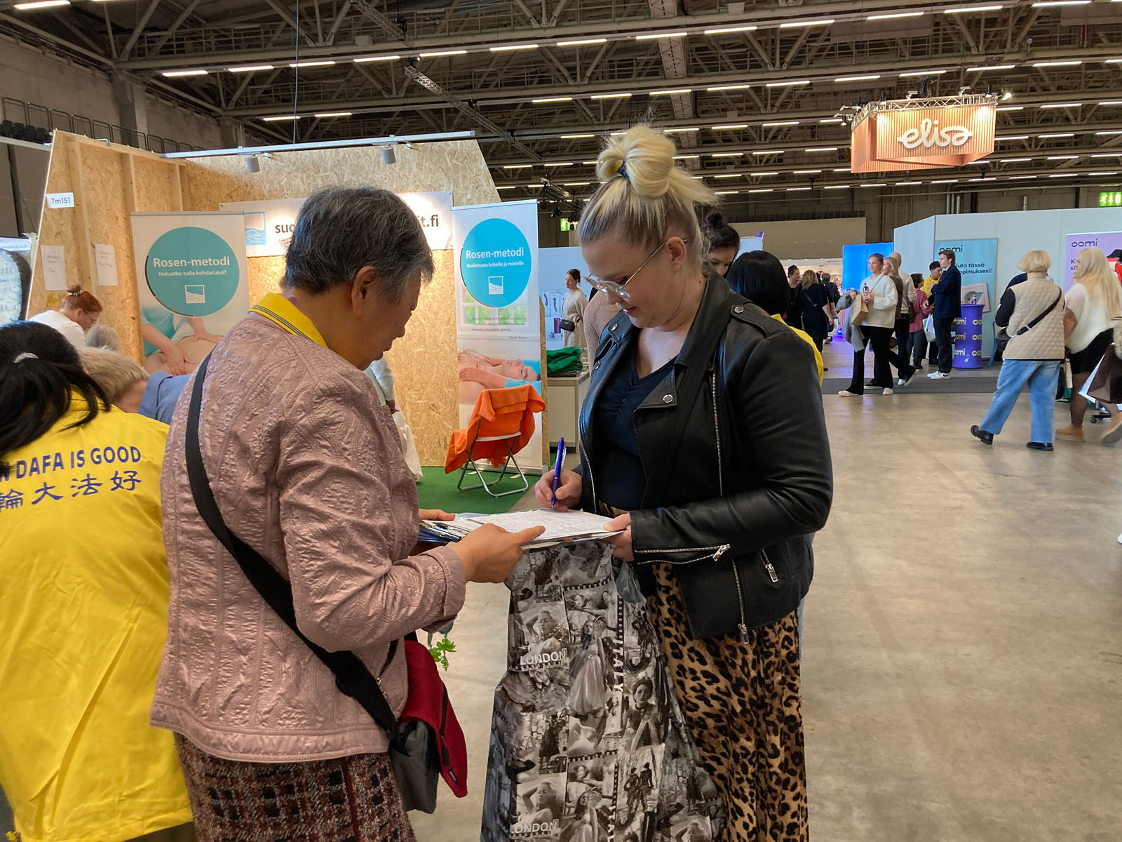 莉莉(Lilja)是一位芬兰语的教师,她见到法轮功展位后毫不犹豫地签名支持。她告诉学员,早前她的一位中国学生曾向她提起法轮功在中国遭受的迫害。看过现场功法展示后,她便主动表示想要学习。