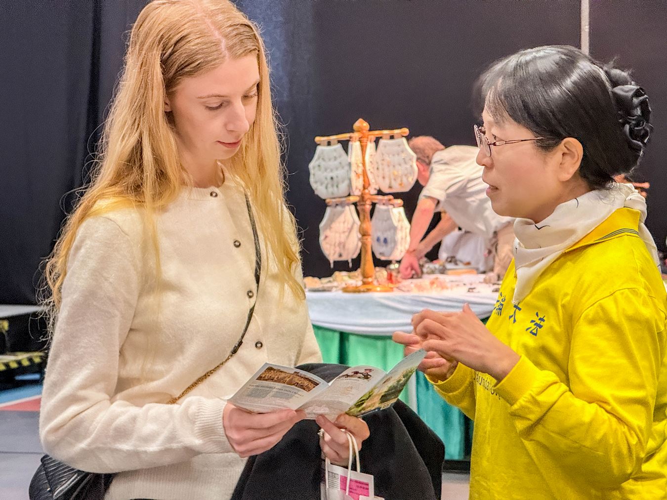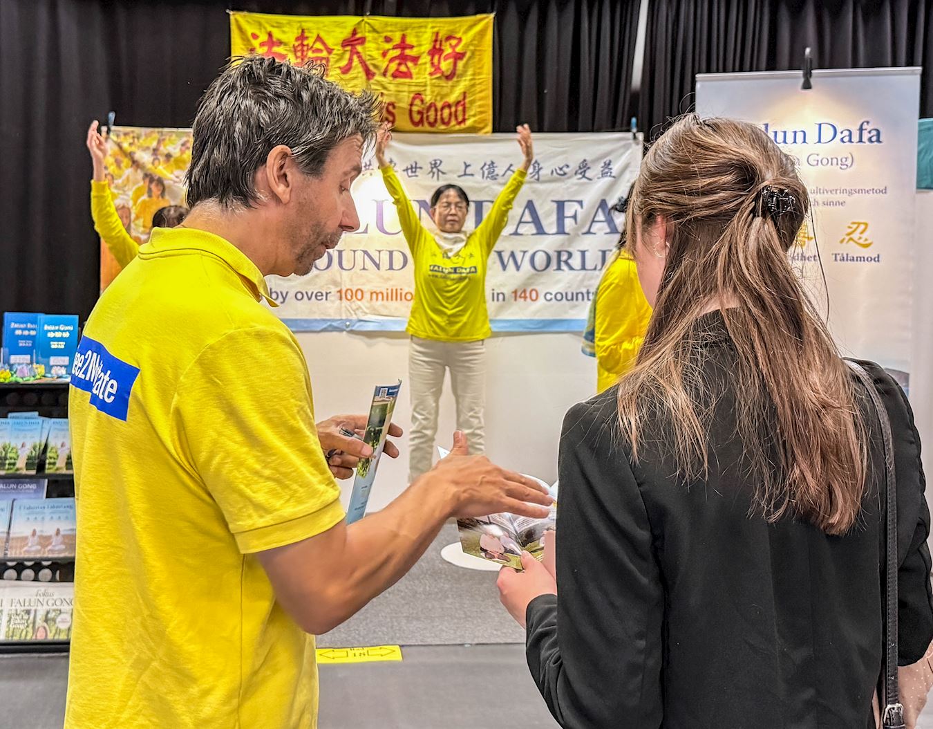 两天展会期间,很多参观者在与学员的交谈中了解到法轮大法是由李洪志先生于一九九二年五月在中国传出的佛家上乘修炼大法,指导修炼者以真、善、忍为原则提升道德与身体健康,至今已弘传一百多个国家,法轮功的主要著作《转法轮》已被译成五十种语言,获褒奖、支持决议案和信函逾万项。听了学员的介绍,人们对法轮功真、善、忍的普世价值表示认同,来展台购买法轮功书籍的有缘人络绎不绝。来自瑞典北部一位年轻女士就是其中的一个。