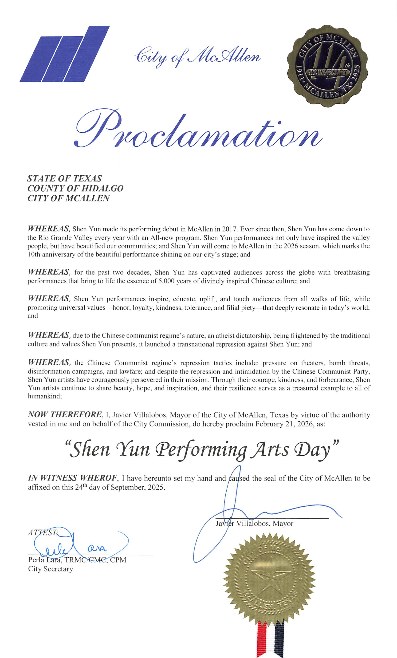 【明慧网二零二五年十月四日】二零二五年九月二十四日,美国德克萨斯州麦卡伦市市长哈维尔·比利亚洛沃斯(Javier Villalobos)正式签署公告,宣布二零二六年二月二十一日为“神韵艺术团日”(Shen Yun Performing Arts Day),此日的演出将迎来神韵在麦卡伦舞台上的十周年纪念。