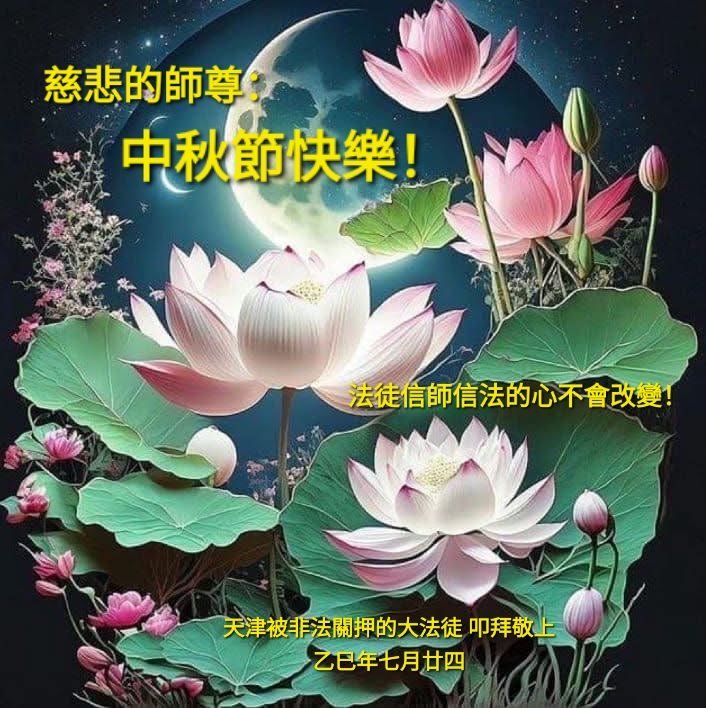 慈悲伟大的师父中秋快乐!请师父放心,弟子一定听师父的话,用法衡量一切,彻底改变千百年来骨子里形成的人的理,用纯净的心态做好三件事,走好最后的路。不负正法时期大法弟子的神圣使命,不负师父的慈悲苦度!感恩师父的慈悲苦度!永恒的感恩!弟子想念师父!