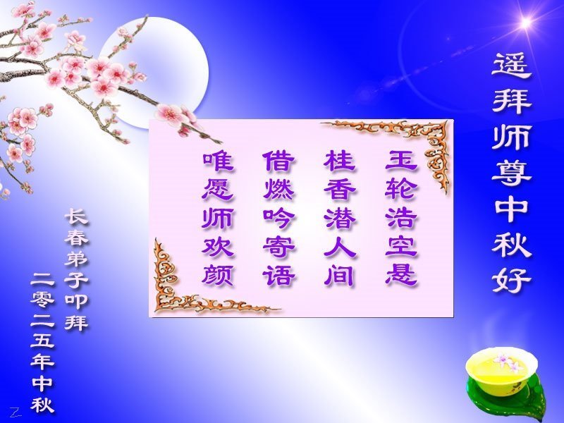 又是中秋团圆日,每逢佳节倍思亲。感恩师父慈悲保护!感恩师父为弟子、为众生得救延续的分分秒秒!师父辛苦了!我们现在真正明白了维护大法就是珍惜生命。弟子现在每天发正念,背法,促三:退.。谢谢师父赐予弟子证实大法的荣耀!期盼师父早日回国团圆!