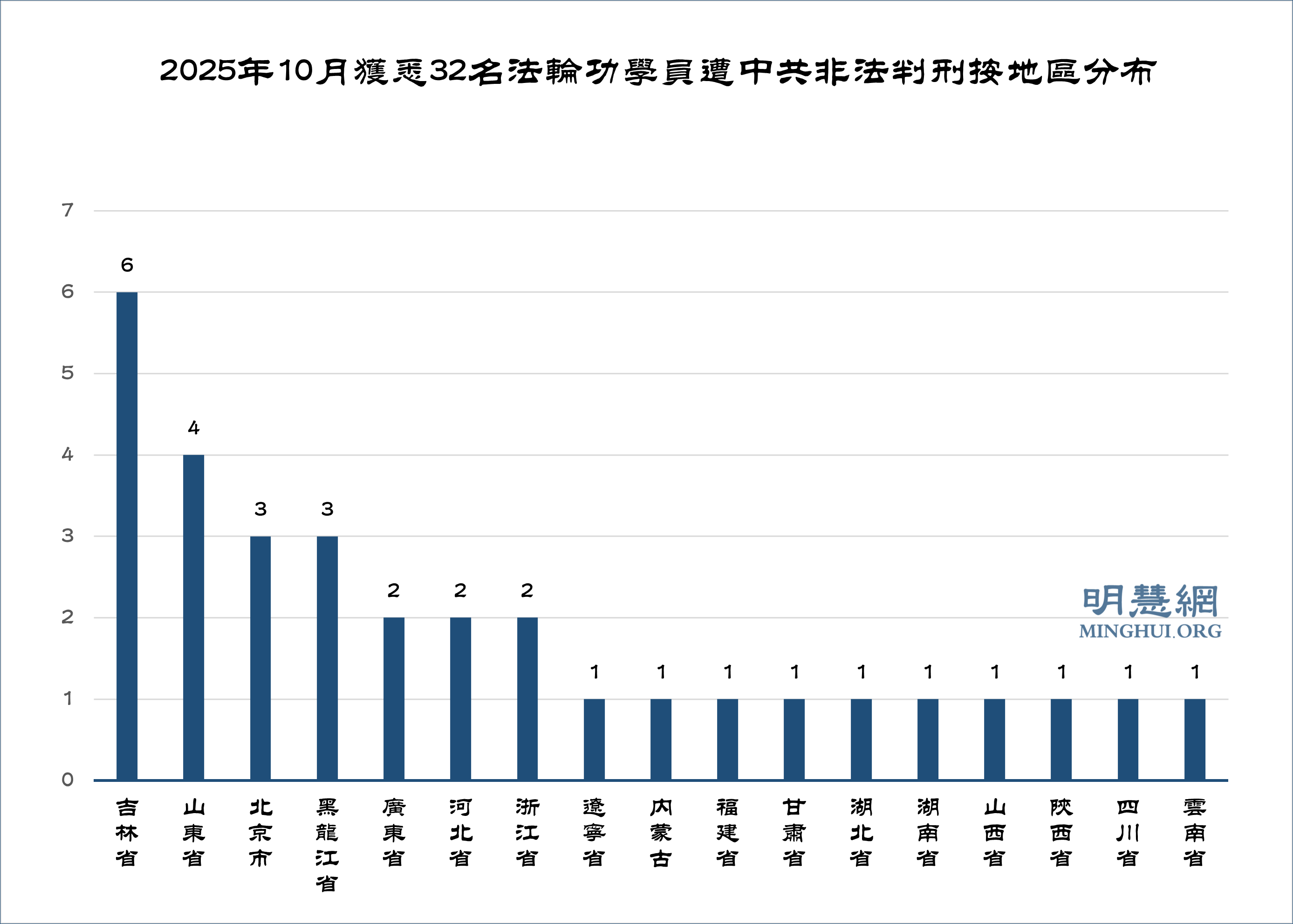 ![]() 图3:2025年10月获悉32名法轮功学员遭中共非法判刑按地区分布 |