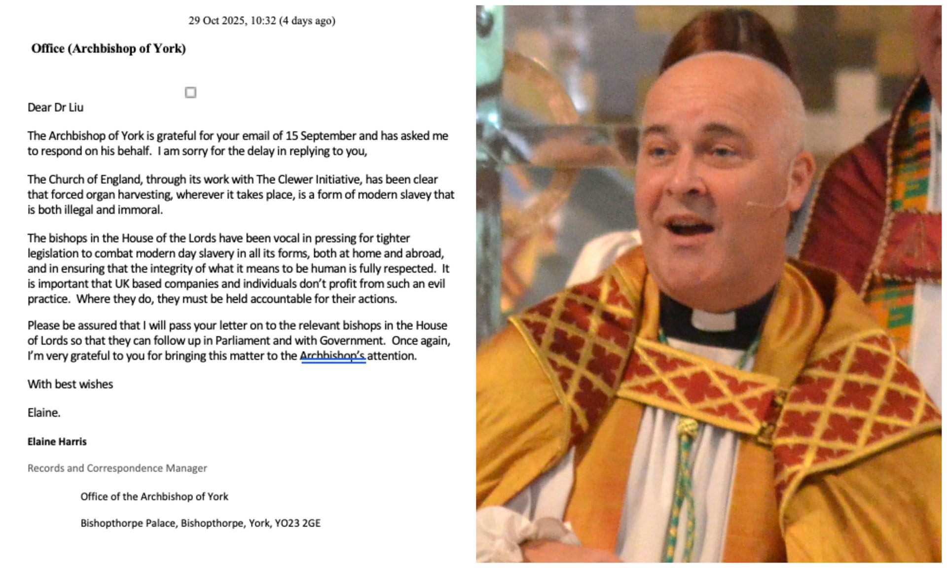 英格兰教会约克大主教通过其办公室邮件表示:“英国国教会(The Church of England)通过与克鲁尔倡议(The Clewer Initiative)的合作,已经明确表示:强制摘取器官——无论发生在何处——都是一种现代奴役形式,既非法又不道德。”