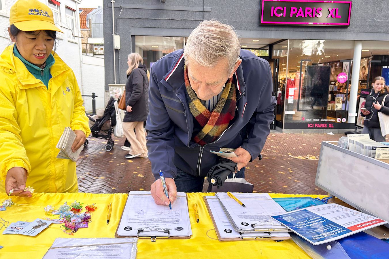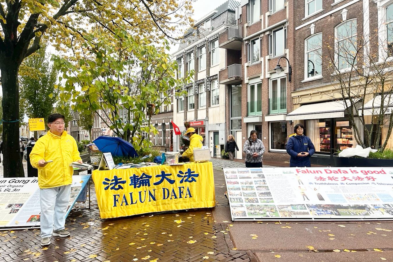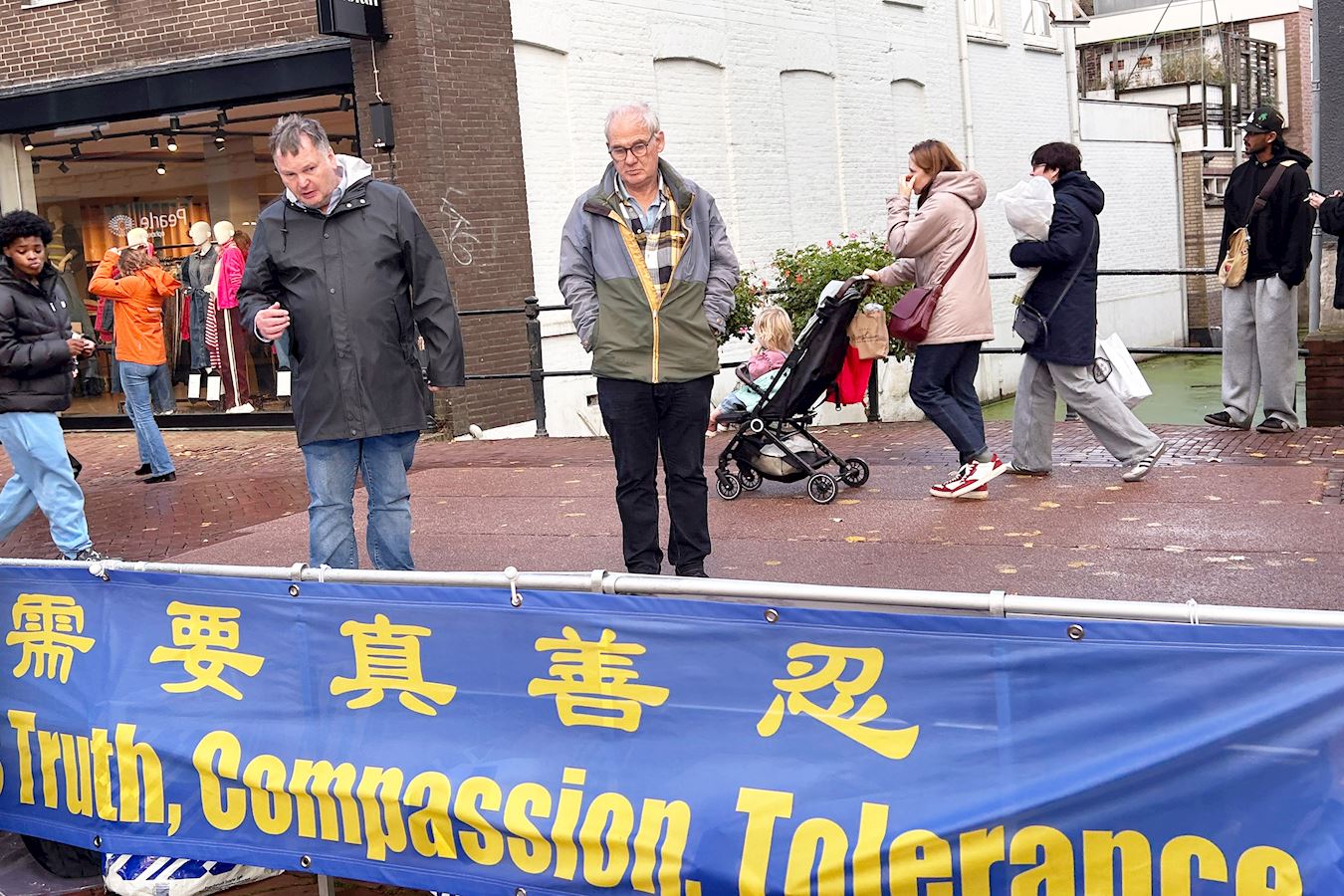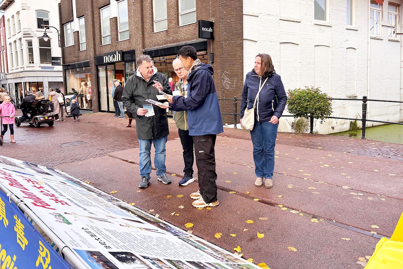 学员给他讲述了从中国传出的法轮大法,使亿万修炼人身心受益,然而从一九九九年七月开始,信仰真善忍的法轮功学员在中国大陆遭受严酷的迫害。听了这些消息,这位先生的表情变得严肃:“我来自美国,是陪妻子来荷兰短期工作的,我从未听说过法轮功被迫害的事情,这太糟糕了!”