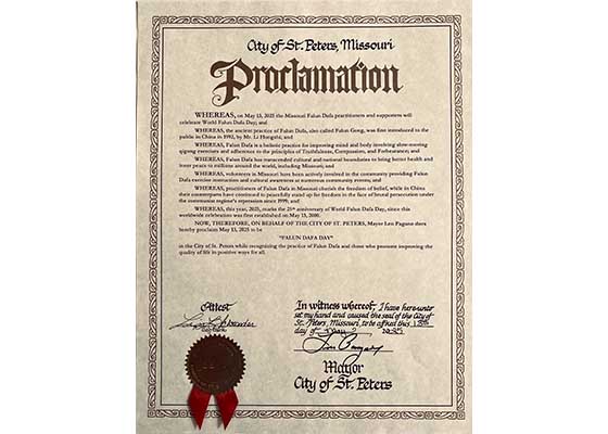 密苏里州圣彼得市褒奖法轮大法 为庆祝世界法轮大法日,美国密苏里州的圣彼得市颁发褒奖,赞扬法轮大法为民众和社区带来的福祉,并宣布2025年5月13日为法轮大法日。