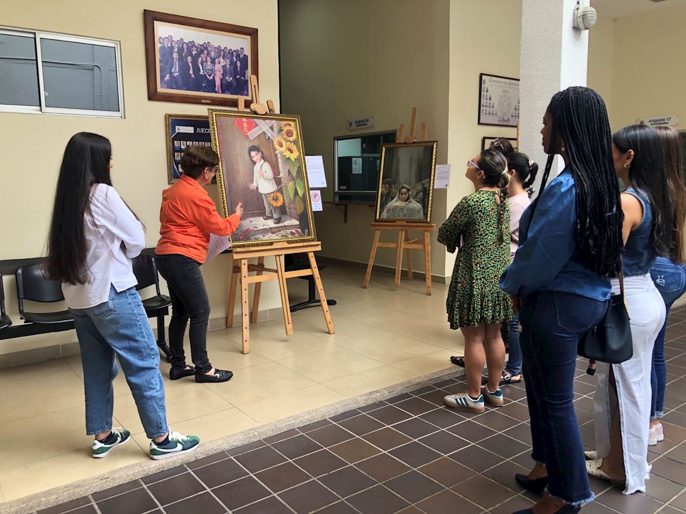 图1:学法轮功员为阿特拉斯大楼的法官和工作人员提供美展导览。