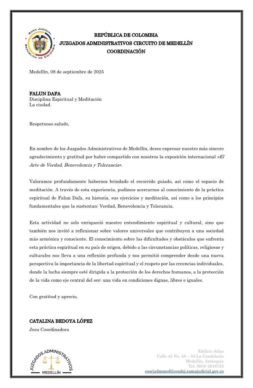 【明慧网二零二五年九月二十九日】二零二五年九月八日,行政法庭协调法官卡塔利娜·贝多亚·洛佩斯(Catalina Bedoya López)致信法轮功学员,感谢法轮功学员在哥伦比亚(Colombia)麦德林市(Medellín)行政法庭(the Administrative Law Courts)所在地阿特拉斯大楼(Atlas),举办真善忍国际美展。