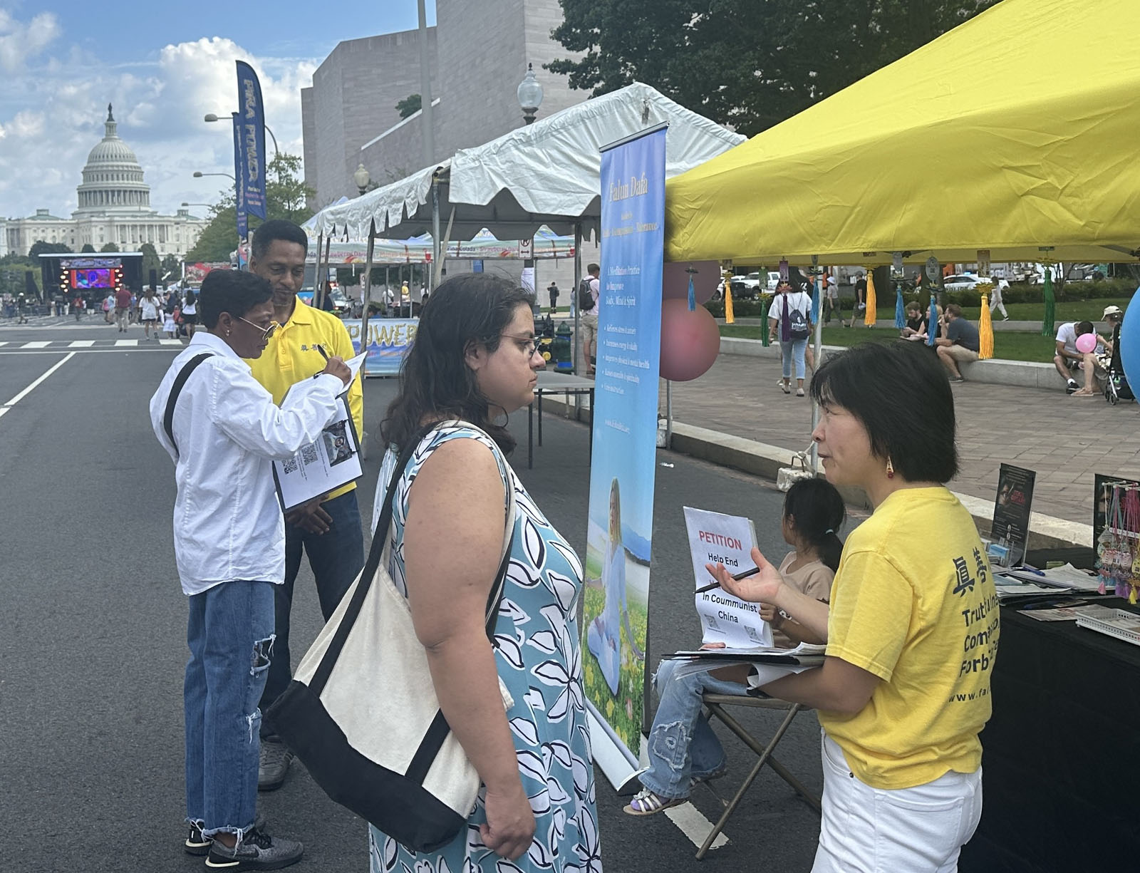 张先生在活动第一天清晨刚刚从中国浙江省抵达美国,当天下午,他在法轮功展位前停留了好长时间,一位曾因不放弃信仰被中共关押的法轮功学员跟他讲了真相。
