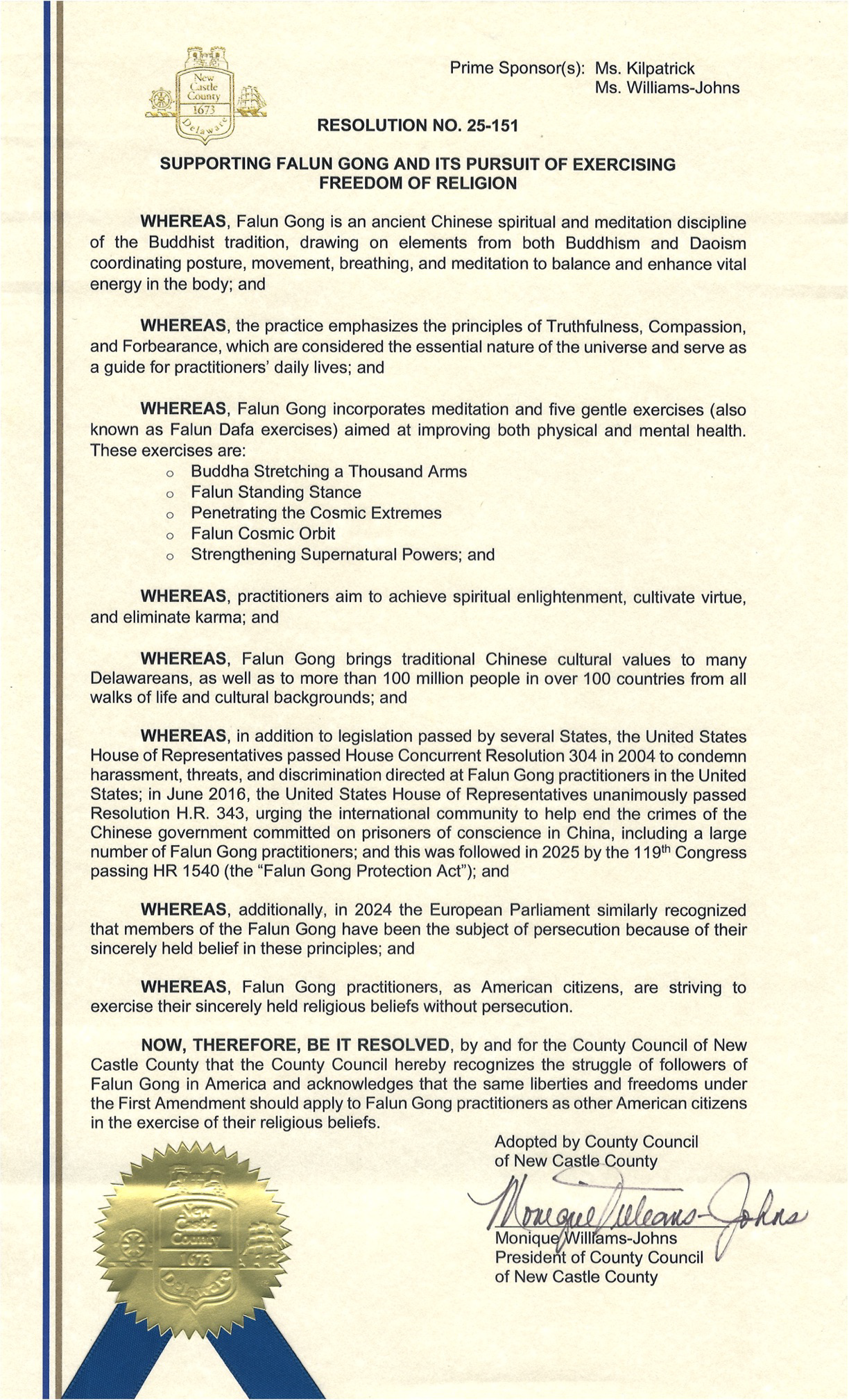 名为“支持法轮功及其追求信仰自由”的R25-151号决议由县议员珍妮特·基尔帕特里克(Janet Kilpatrick)和县议会议长莫妮克·威廉姆斯-约翰斯(Monique Williams-Johns)共同发起。 根据该决议,县议会明示法轮功修炼者在践行其信仰时应享有与美国公民同等的《第一修正案》保护权。  图3:美国特拉华州纽卡斯县议会于二零二五年八月二十六日通过的R25-151号决议,支持法轮功学员的信仰自由权利。 |